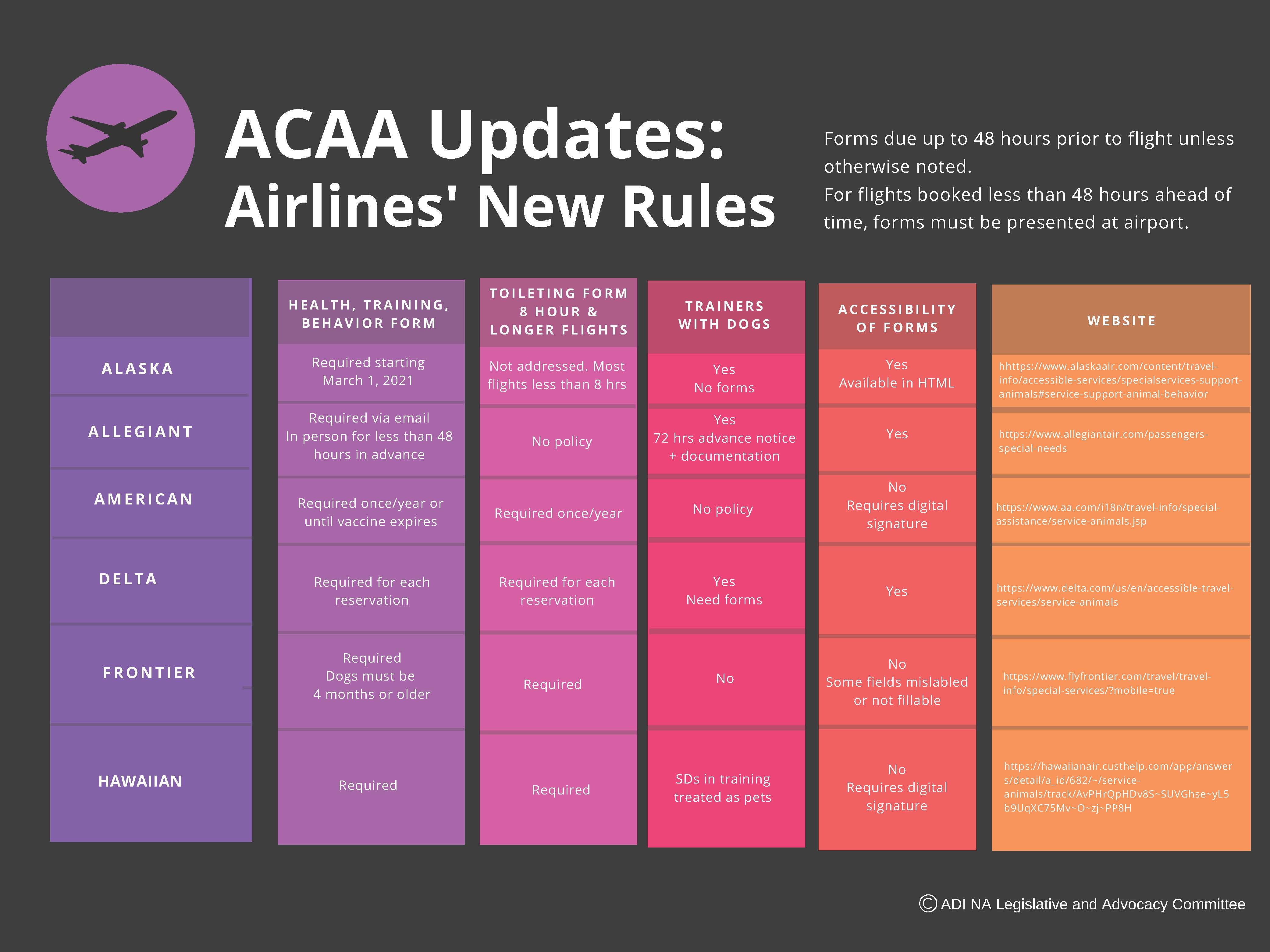 The chart provide an overview of each airline’s policies, whether the forms are accessible and links to the section of their websites pertaining to traveling with Assistance Dogs. They also show each airline’s current policies for trainers.