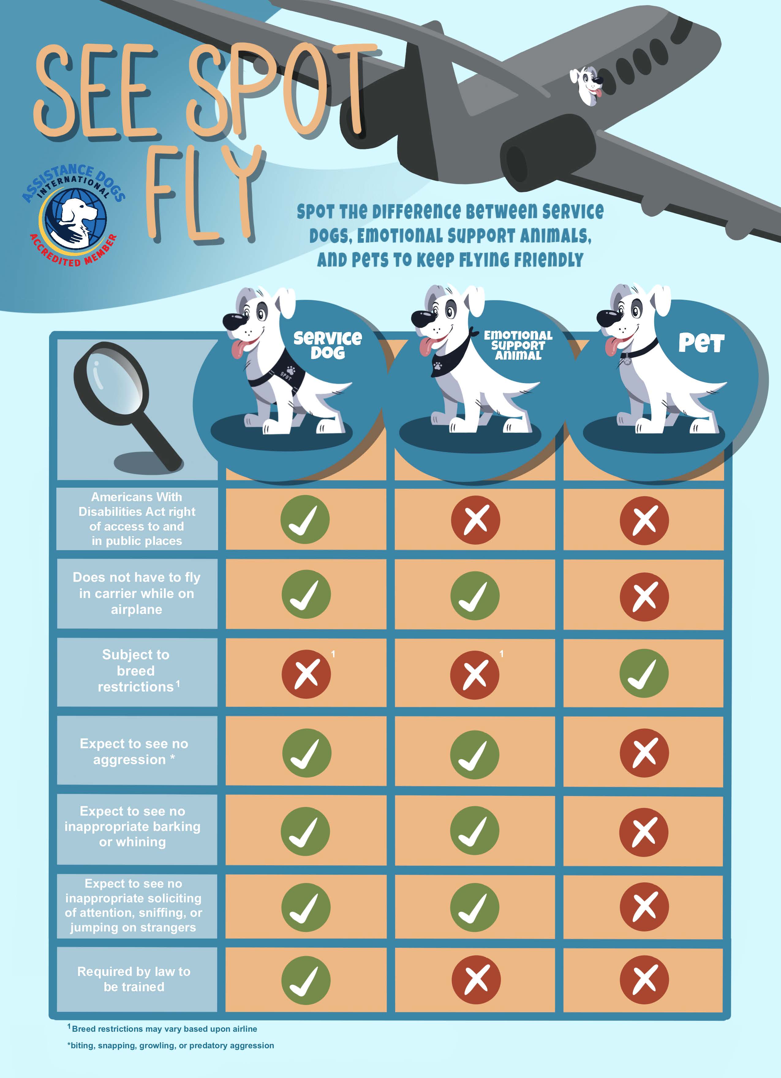 We encourage every ADI NA member program to educate their local airport personnel with the assistance of a PowerPoint that has been developed. Contacting the marketing and communications department of your local airport is a good starting point, if you don't already have a contact. After presenting this material, please fill out the form on the link below so that we can track which airports this has been shared and determine which ones we need to target more specifically. These is also an airline access campaign poster that can be shared in a printed format of any size that describes the differences between service dogs, emotional support animals and pets. ADI NA encourages each program to supply their graduate teams with an ADI accredited member logo or patch on their working dogs' vests/capes or equipment to help identify our graduates while in airports and the general public.